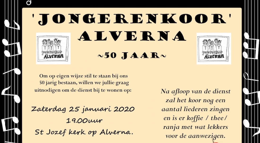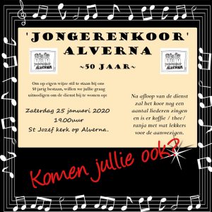 Naar aanleiding van het 50-jarig bestaan van Jongerenkoor Alverna zal het huidige koor in de dienst in de St. Jozefkerk van zaterdag 25 januari stilstaan bij dit feit. Na de dienst zal het koor nog wat liedjes zingen, daarna is er koffie en thee met iets lekkers in de kerk. De huidige koorleden zullen zelf de lezingen lezen en de taken van de koster tijdens de dienst overnemen. De aanvang van de dienst is 19.00 uur.