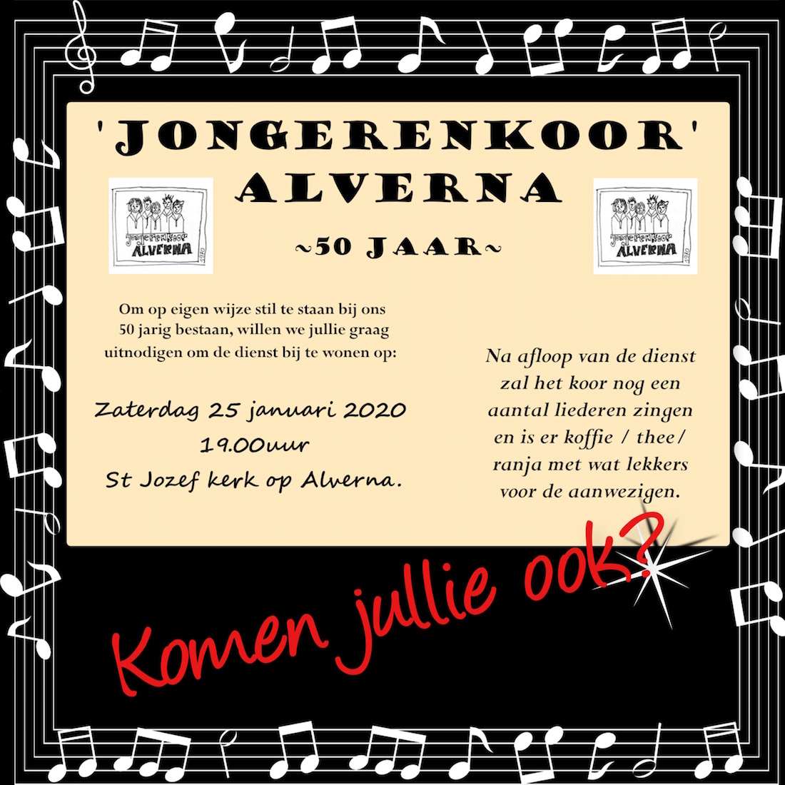Omdat het jongerenkoor inmiddels 50 jaar bestaat, is het plan ontstaan om een reünie te organiseren. Leden en oud-leden zijn van harte welkom op vrijdag 27 maart 2020 in de Oase in Alverna.