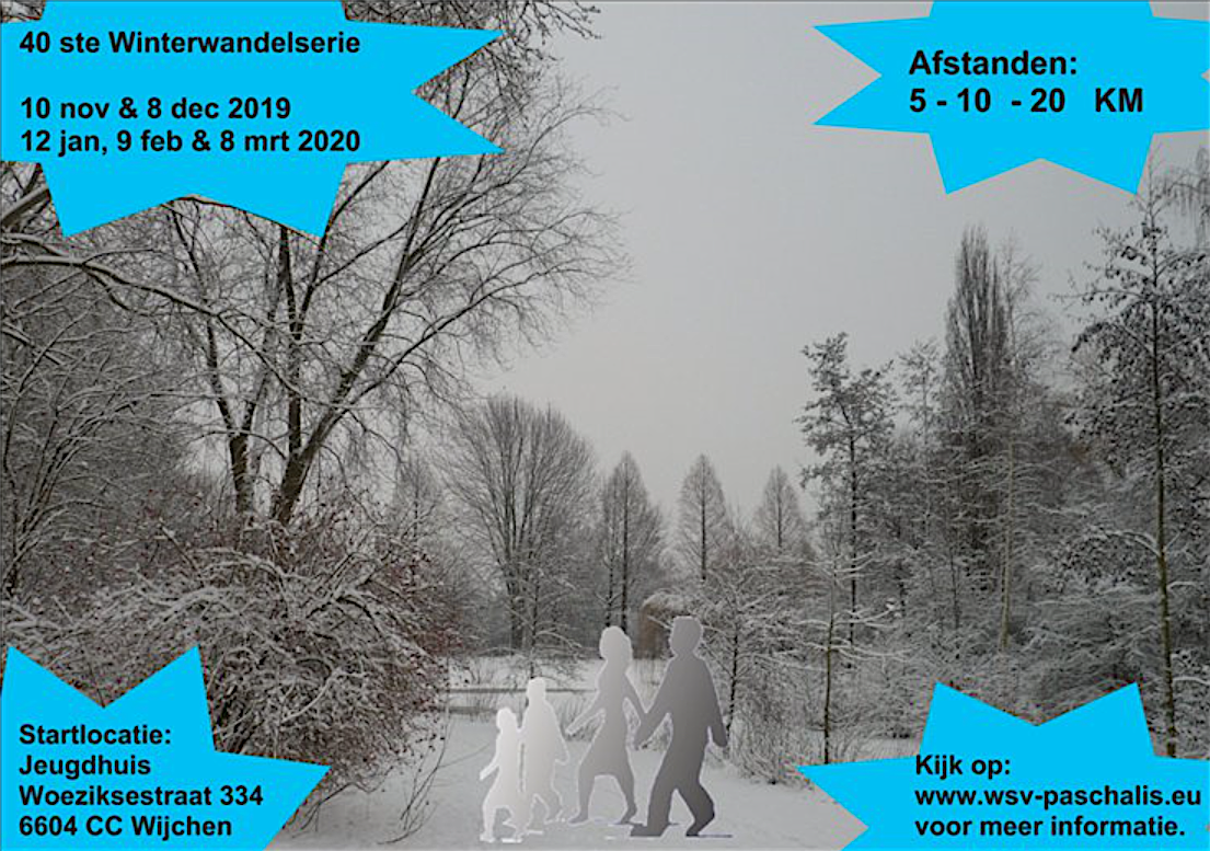 Zondag 9 februari is de 4e tocht van de Winter Wandelserie van wsv Paschalis. Het is een aangename en gezonde manier om te wandelen. De afstanden die men kan wandelen zijn 5- 10 - 20 en 30 km