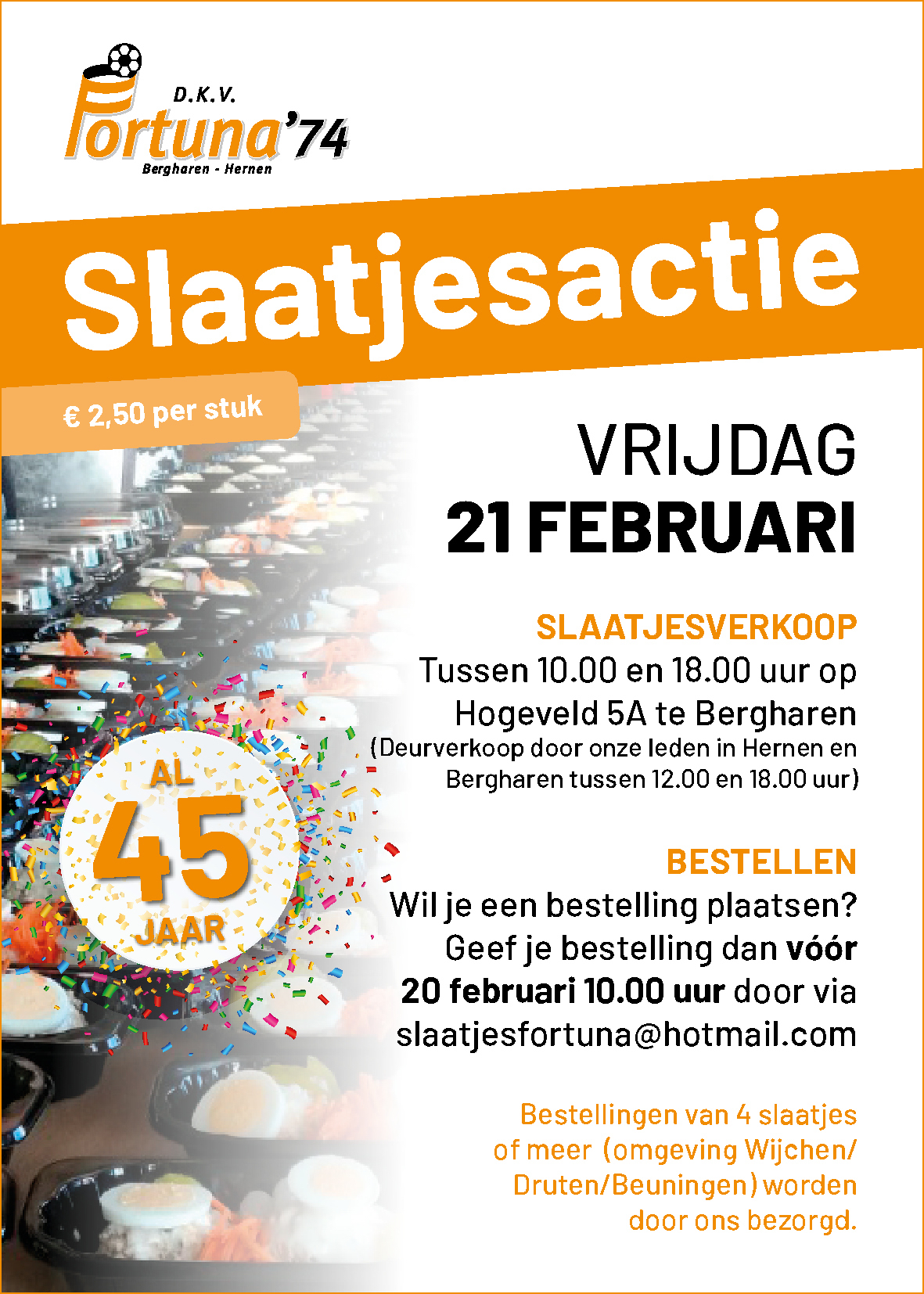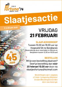 Al 45 jaar worden er de vrijdag voor carnaval de lekkerste slaatjes verkocht door korfbalvereniging Fortuna’74 uit Bergharen voor €2,50 per stuk: "De actie is een groot succes in Hernen en Bergharen, maar wat vele mensen niet weten is dat wij ook op bestelling rijden! Zin in een slaatje voor thuis, in de pauze op het werk of tijdens de optocht? Laat het weten! We komen ze met liefde bezorgen. Alle opbrengst gaat naar onze fijne club." Klik op de poster voor alle informatie over de slaatjesverkoop op 21 februari en de slaatjes op bestelling.