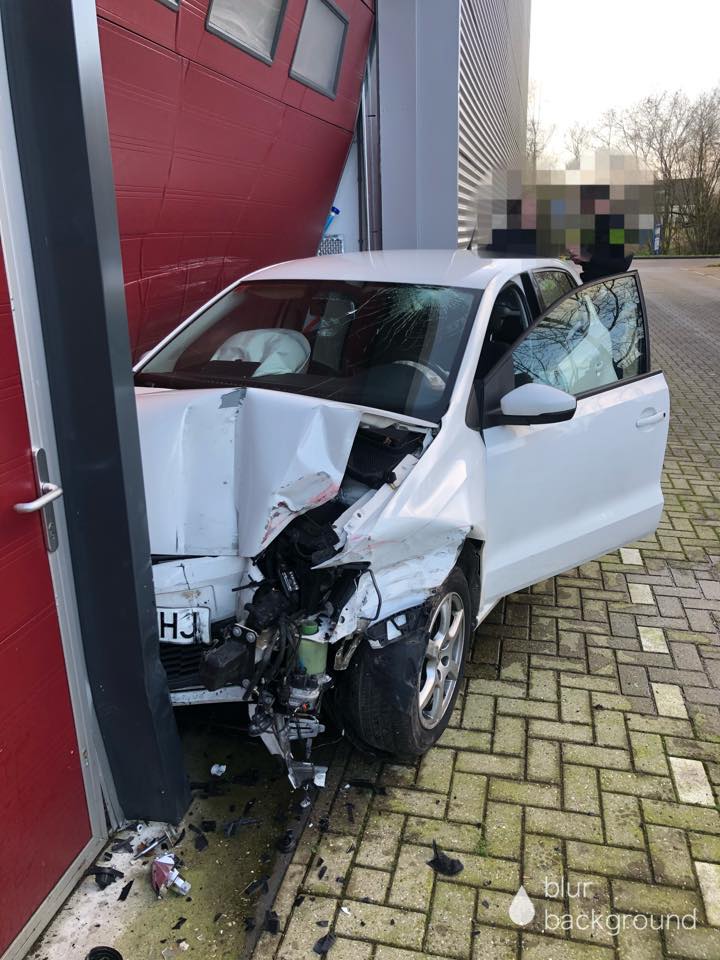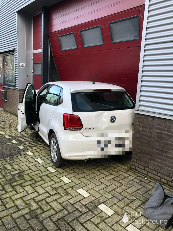 De bestuurder van een Volkswagen Polo was de macht over het stuur verloren en is op een bijzondere wijze tot stilstand gekomentegen een bedrijfspand op Bijsterhuizen.