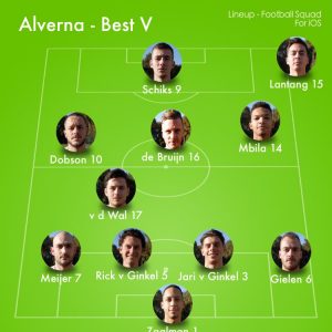Opstelling: Robert Zaalman; Job Gielen, Jari v Ginkel ©, Rick v Ginkel (’24 Dennis Arts), Danny Meijer; Mels Lantang, Cas vd Wal, Owen Mbila (‘75 Arthur vd Eeckhout), Derek de Bruijn (’53 Danny Vos), Johnny Dobson; Bart Schiks