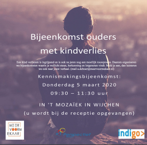 In 't Mozaïek in Wijchen is op dondedag 5 maart van 9.30-11.30 uur de bijeenkomst 'Lotgenoten kindverlies'. Om je verhaal te delen, mee te denken, begrip en erkenning voor je verdriet.