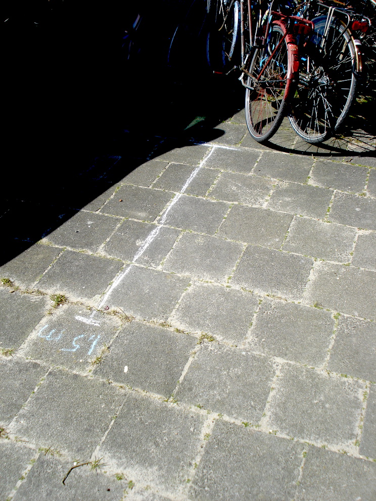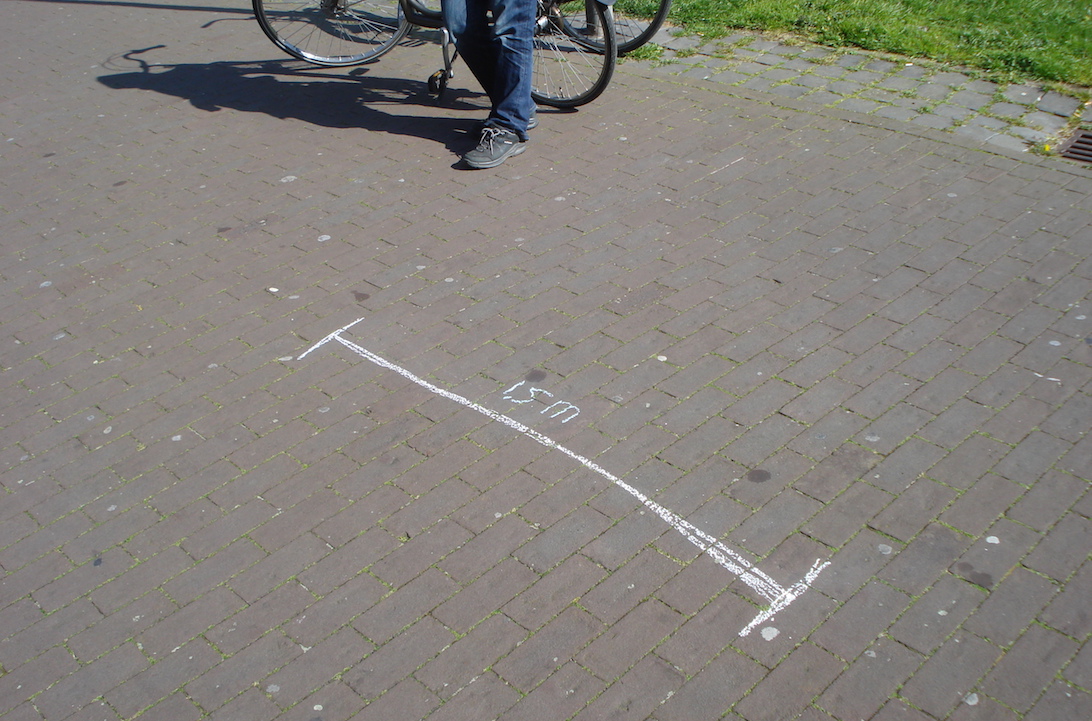 Op straat kwamen we deze stoeptekeningen tegen, waarbij wordt aangegeven hoeveel anderhalve meter nou precies is. Als je met iemand links en rechts van de streep gaat staan denk je: zo ver? Ik had 't iets minder verwacht...