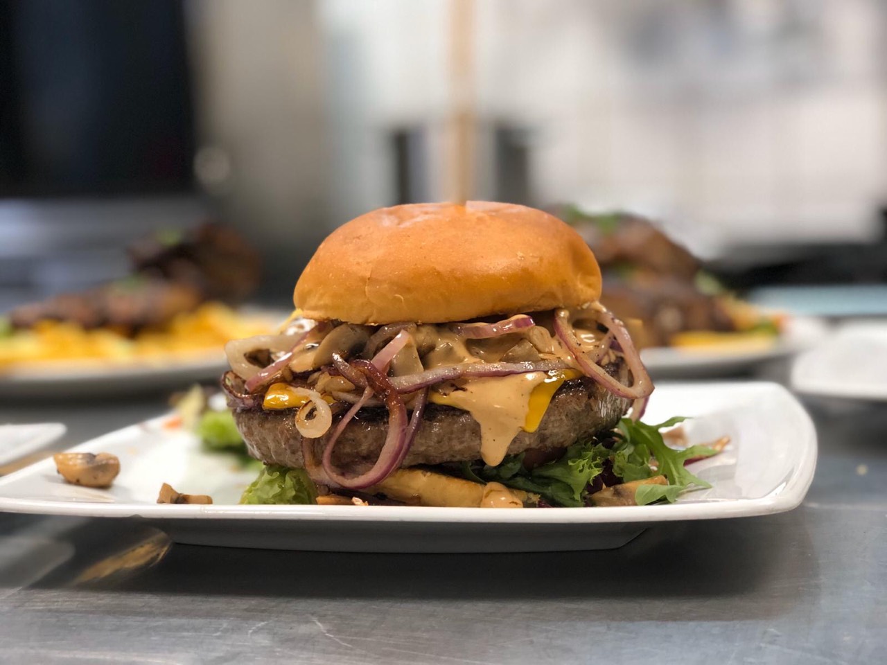 - THE EMPIRE STATE BURGER: Stack van 3 beefburgers 225 gr met cheddar, bacon, ui en onze famous BBQ saus.