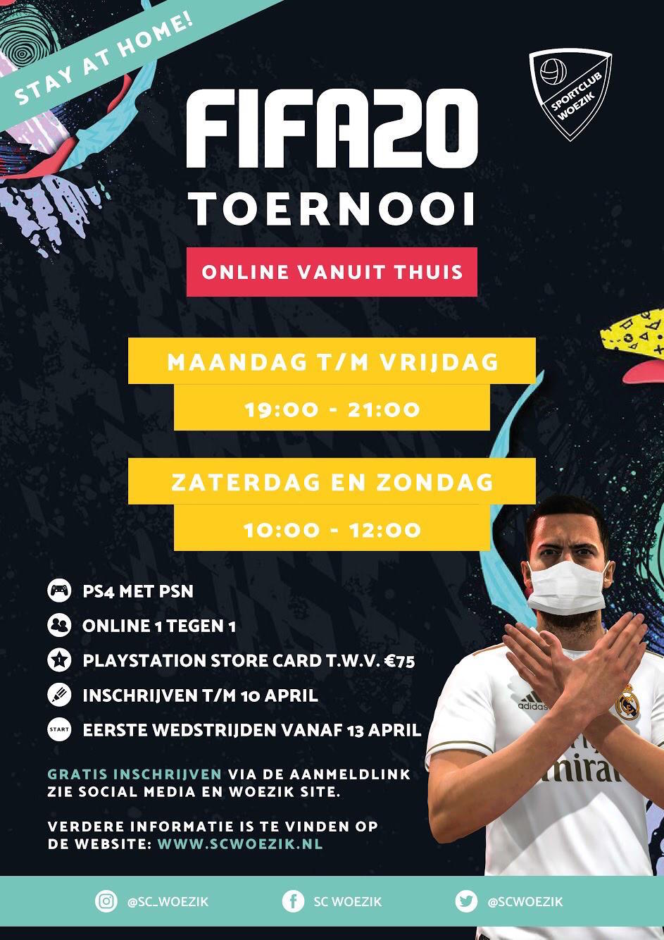 Door de maatregelen kan ook het succesvolle FIFA-Toernooi 2019 van afgelopen jaar geen vervolg krijgen in de kantine van sc Woezik. Om toch er voor te zorgen dat de leden en niet-leden met elkaar in contact blijven, organiseert sc Woezik het FIFA-Toernooi 2020 ‘online’. Dit wil zeggen dat iedereen vanuit huis mee kan doen aan het toernooi op de PlayStation 4. FIFA20 is het virtueel voetballen op de gameconsole. “