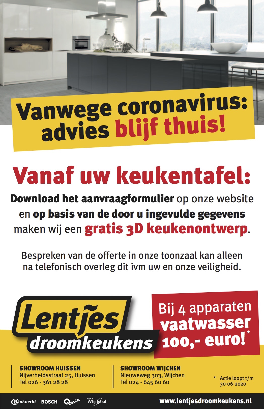 De keukenspecialist aan dé Woonboulevard XXL aan de Nieuweweg in Wijchen kiest voor uw gezondheid. Op maandag 13 april 2e Paasdag zal Lentjes Droomkeukens namelijk niet geopend zijn. “Wij adviseren onze klanten en ook ons personeel om thuis te blijven, want ons gezamenlijk welzijn gaat voor alles!”