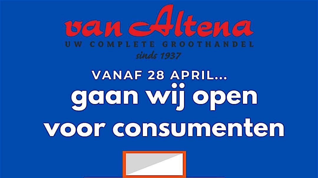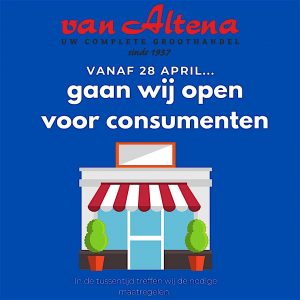 Per dinsdag 28 april is het mogelijk om aan de Pieter Zeemanstraat 11 al uw levensmiddelen te kopen! De groothandel in levensmiddelen van de gebroeders Van Altena opent haar deuren namelijk voor iedereen! “Vanaf dinsdag 28 april zullen wij onze deuren óók openen voor consumenten. Tot die tijd zullen wij bezig zijn met het treffen van extra informatievoorzieningen in ons magazijn, bestickeringen van producten en looproutes én natuurlijk (extra) veiligheidsmaatregelen zodat iedereen onbezorgd zijn boodschappen kan doen. Uiteraard zoals voorgeschreven door het RIVM.