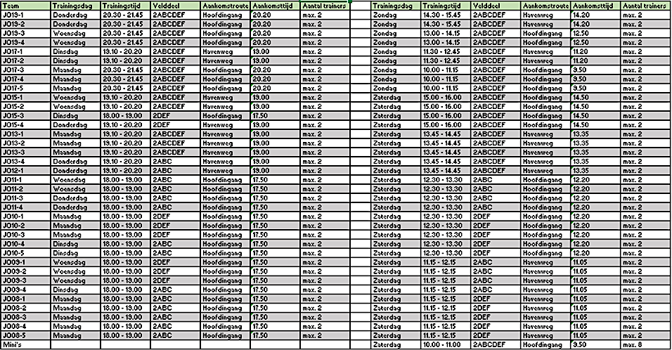 • Trainers arriveren 20 minuten voor aanvang van hun training door dezelfde poort als hun spelers. Bij aankomst organiseren zij buiten hun materiaal. Instructie volgt ter plekke. Elke groep krijgt 20 markeringshoedjes, ballen en hesjes. Doeltjes zijn in overleg te gebruiken en staan op het veld of daarbuiten.