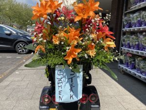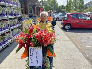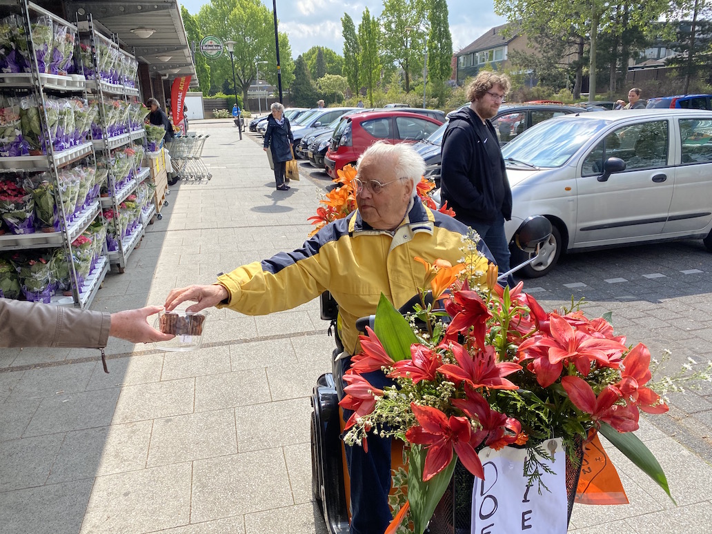De 85-jarige Jan geeft tijdens de coronacrisis een bloemetje aan leuke mensen. We kwamen hem in Winkelcentrum Wijchen-Noord tegen. Jan liet weten: “Vooral de reacties als ik ze geef zijn super. Het is dan net een roos die openbloeit!” En soms ontvangt de kleurrijke bloemenman zelf ook een traktatie.