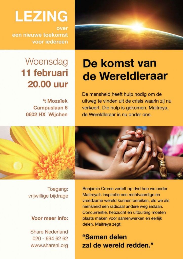 Zijn naam is Maitreya. Hij wordt binnen alle religies verwacht onder verschillende namen, maar Maitreya is de Wereldleraar voor alle mensen, gelovig of niet. Met Zijn Broeders, de Meesters van Wijsheid, is Hij nu hier om ons te helpen de meest dringende wereldproblemen op te lossen. Samen zullen Zij ons inspireren tot het scheppen van een compleet nieuwe beschaving, Met een economie die gebaseerd is op samen delen, zal deze gekenmerkt worden door rechtvaardigheid, vrede en eenheid van de mensheid.