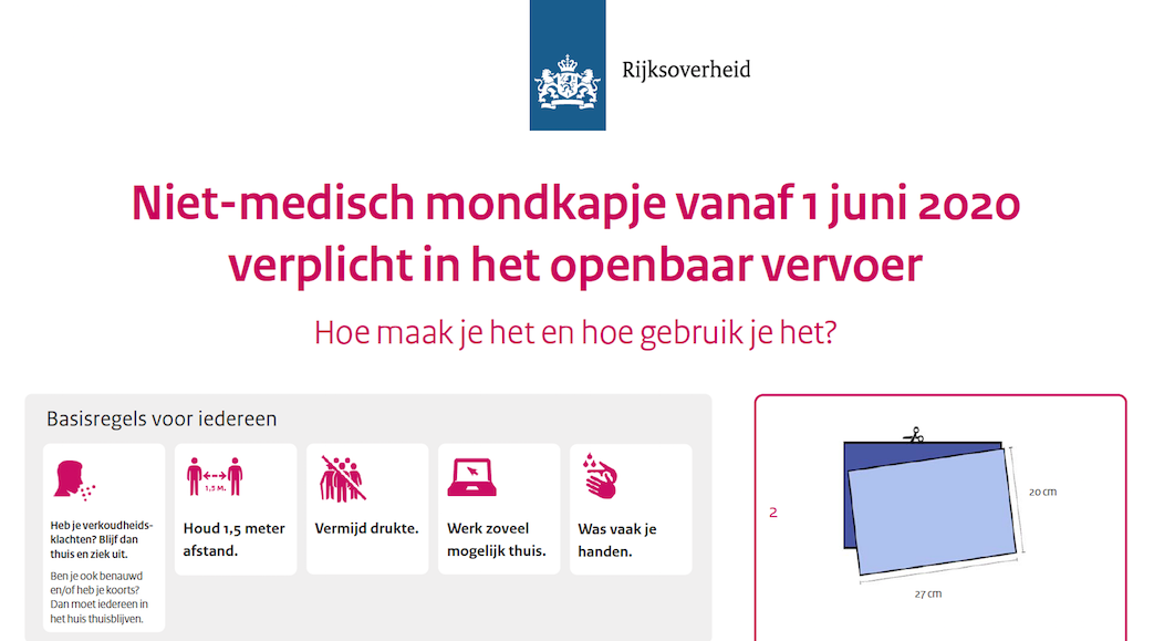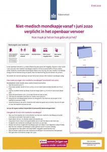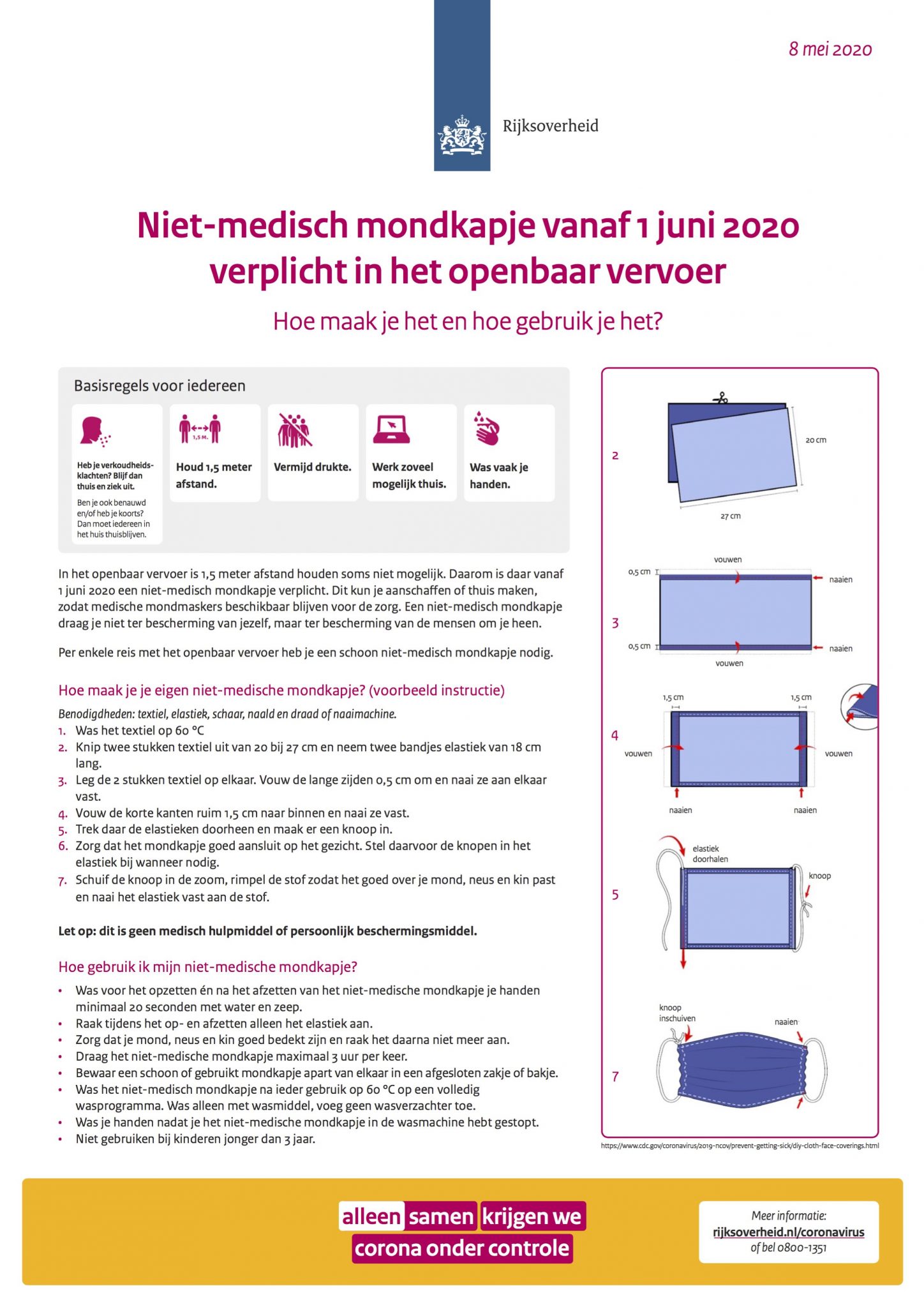 website: "In het openbaar vervoer is 1,5 meter afstand houden soms niet mogelijk. Daarom is daar vanaf 1 juni 2020 een niet-medisch mondkapje verplicht. Dit kun je aanschaffen of thuis maken, zodat medische mondmaskers beschikbaar blijven voor de zorg. Een niet-medisch mondkapje draag je niet ter bescherming van jezelf, maar ter bescherming van de mensen om je heen. Per enkele reis met het openbaar vervoer heb je een schoon niet-medisch mondkapje nodig."