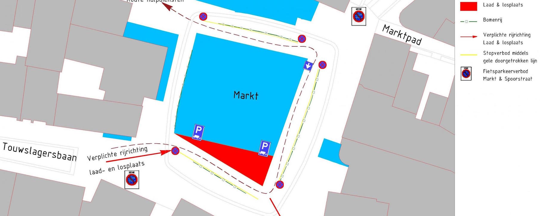 Er is al een eenrichtingsverkeer voor motorvoertuigen op de Markt. Dit wordt nu nog belangrijker, want auto’s kunnen elkaar niet passeren. De routes zijn: