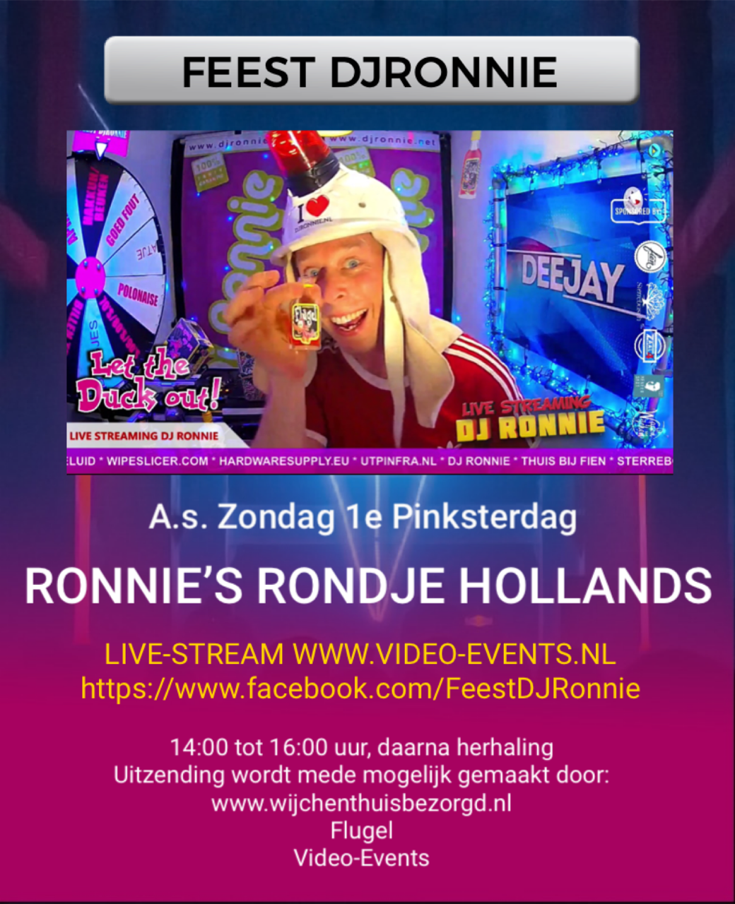 DJ Ronnie gaat weer livestreamen! Hij laat ons weten: "Aanstaande zondag 1e Pinksterdag, gaan we weer een Online Feestje geven, thema is dit keer “Rondje Hollands”, kijk vanaf 14:00uur tot 16:00 uur gezellig mee via FB/Twitch/