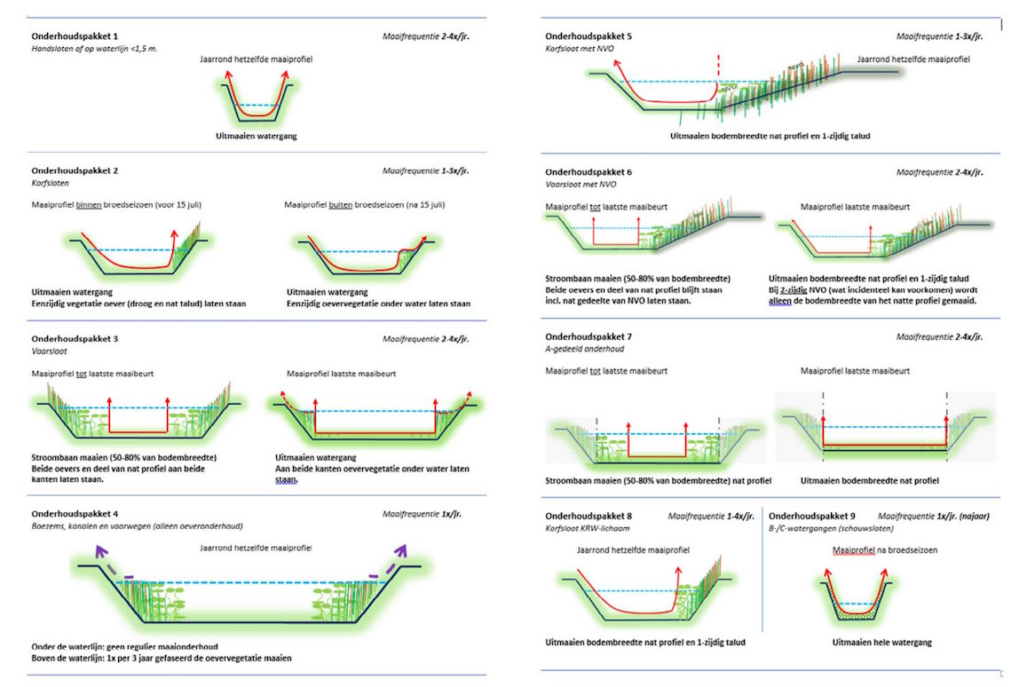 Het groeiseizoen (1 april – 1 oktober) en het broedseizoen (15 maart – 15 juli) zijn belangrijke kaders uit de Wet Natuurbescherming. In het groeiseizoen laat het waterschap voortaan onder water minstens een kwart van de planten staan en in het broedseizoen is dat de helft van de planten op de oever. "We zetten natuurvriendelijker materieel in. Maaisel wordt zo veel mogelijk uit het water gehaald. Op de dijken gebeurt dat laatste al jaren, waardoor de grond verschraalt. In de komende jaren worden onderhoudscontracten vernieuwd en een ecologisch werkprotocol ingevoerd."
