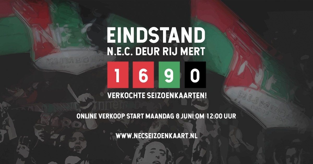 Mocht je gisteren niet in de gelegenheid zijn geweest om jouw seizoenkaart te verlengen of aan te schaffen, dan is dit mogelijk vanaf aanstaande maandag 8 juni. De online verkoop start dan om 12.00 uur via www.necseizoenkaart.nl. Daarnaast kun je je seizoenkaart natuurlijk bemachtigen bij de balie in het Goffertstadion.