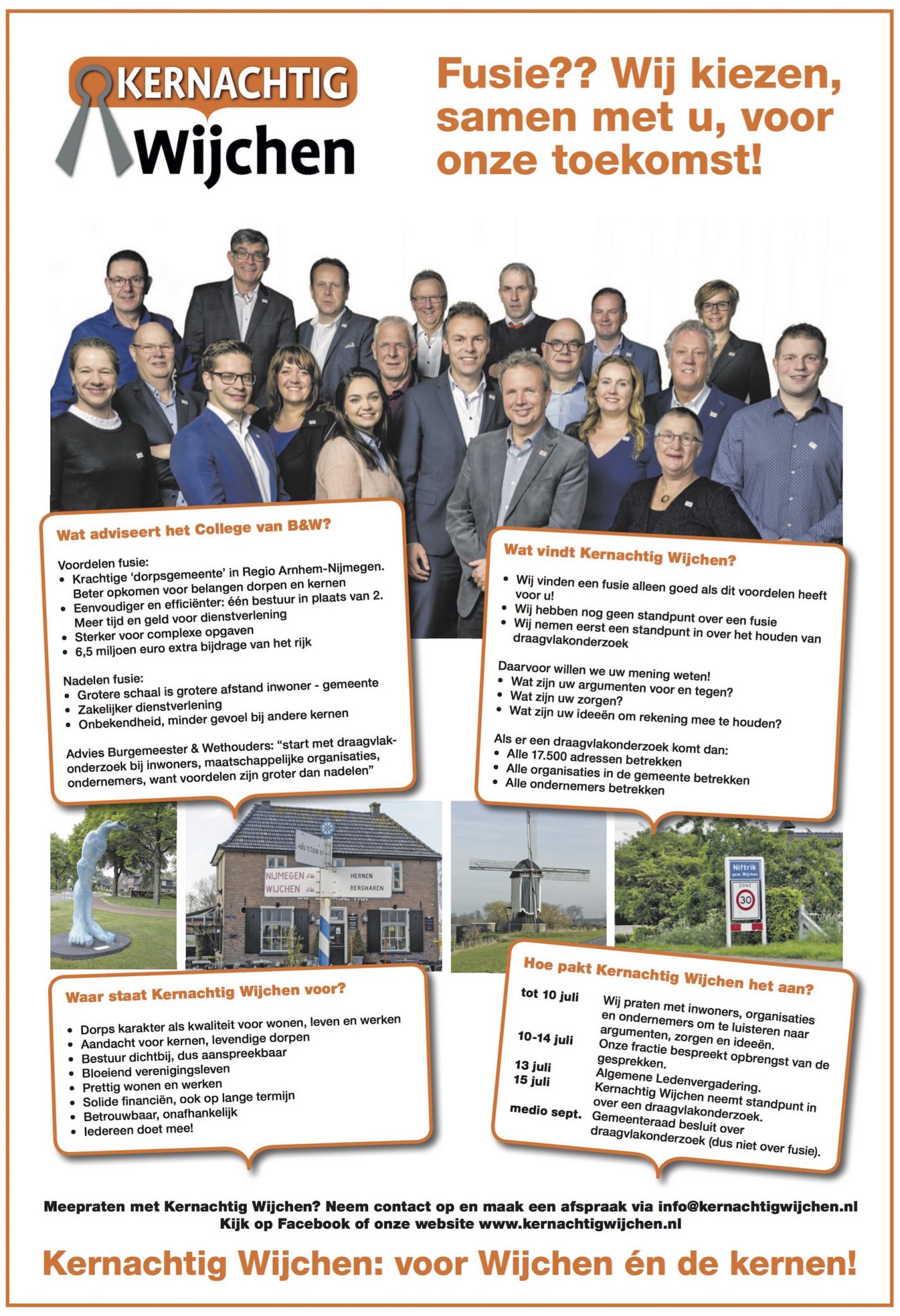 Wijchens grootste partij Kernachtig Wijchen heeft nog niets besloten over een fusie met Druten. Eerst wil de partij in gesprek en vooral luisteren. "Tot 10 juli praten wij met inwoners, organisaties en ondernemers om te luisteren naar argumenten, zorgen en ideeën."