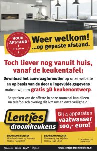 Weer welkom bij Lentjes Droomkeukens aan de Nieuweweg in de showroom - of thuis vanaf de keukentafel: download het aanvraagformulier op de website en op basis van de door u ingevulde gegevens maakt Lentjes een gratis 3D keukenontwerp.