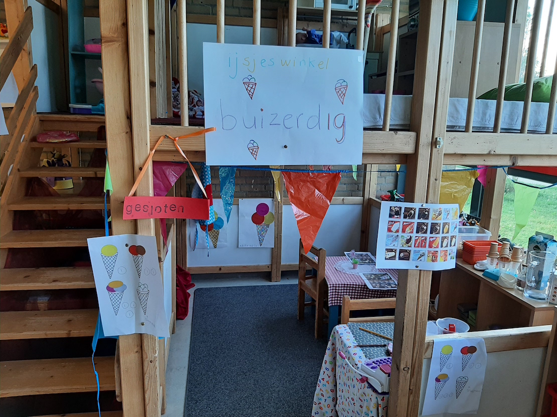 Bij de kleuters op de Buizerdschool hebben ze ijssalons gemaakt in de klas vanwege het thema"Zomer en vakantie". Bij juf Sandra en Monique hebben de kinderen zelf een naam bedacht, namelijk Buizerd 19.