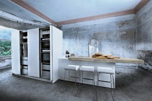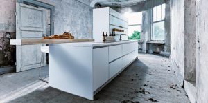Deze keuken is met 4 cm dik werkblad strak afgewerkt in dezelfde kleur als de keukenkasten. Blikvanger zijn de achterwanden die tegen de achterkant van de hoge kasten is geplaatst, waaraan allerlei verschillende accessoires gehangen kunnen worden. Deze keuken is beloond met de RED DOT Design Award.