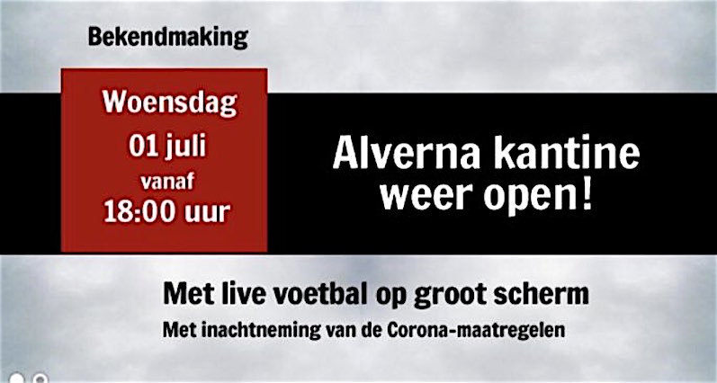 De sportkantine van vv Alverna gaat weer open! Op woensdag 1 juli vanaf 18.00 uur. Met op een groot scherm live voetbal - en natuurlijk een drankje en een hapje. De club meldt: "Welkom! En hou je aan de regels!"
