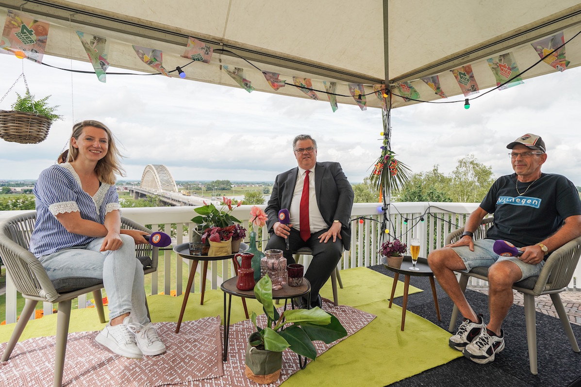Tussen de optredens door vertellen interessante gasten als Sinan Can, de burgemeester en Nachtburgemeester, Twan Krebbers van Matrixx Events, onderzoeker Floris Meens, Antwan van Horik van Festival op ’t Eiland en Sander Ederveen van Stichting Roze Woensdag over hun gevoel en ervaringen van Vierdaagsefeesten. Elke uitzending heeft een speciale bijdrage van de Stadsdichter en een anekdote van Hein Fokker, die je een kijkje achter de schermen gunt. Uiteraard zie je ook volop sfeerbeelden van hoe er normaal een week lang anderhalf miljoen mensen feest vieren in Nijmegen.