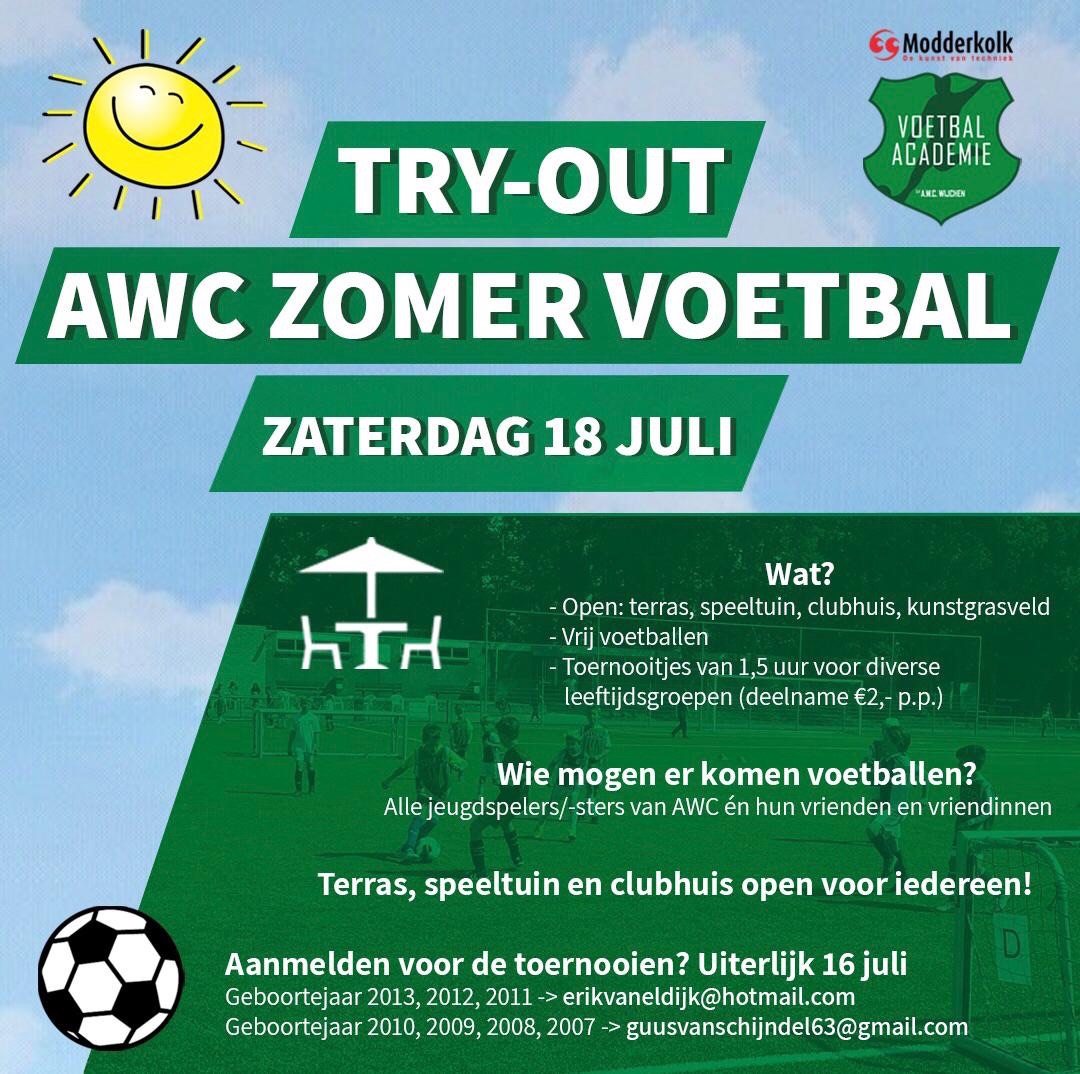 We kregen veel positieve reacties op de try-out van afgelopen zaterdag 11 juli, dus gaan we door! Op zaterdag 18 juli staat de tweede activiteit gepland van de AWC-zomer. Vanaf 14.00 uur is wederom een helft van het kunstgrasveld beschikbaar om vrij te voetballen (zelf bal meenemen) en op de andere helft organiseren we gedurende de dag weer voetbaltoernooitjes van ongeveer anderhalf uur per leeftijdsgroep.
