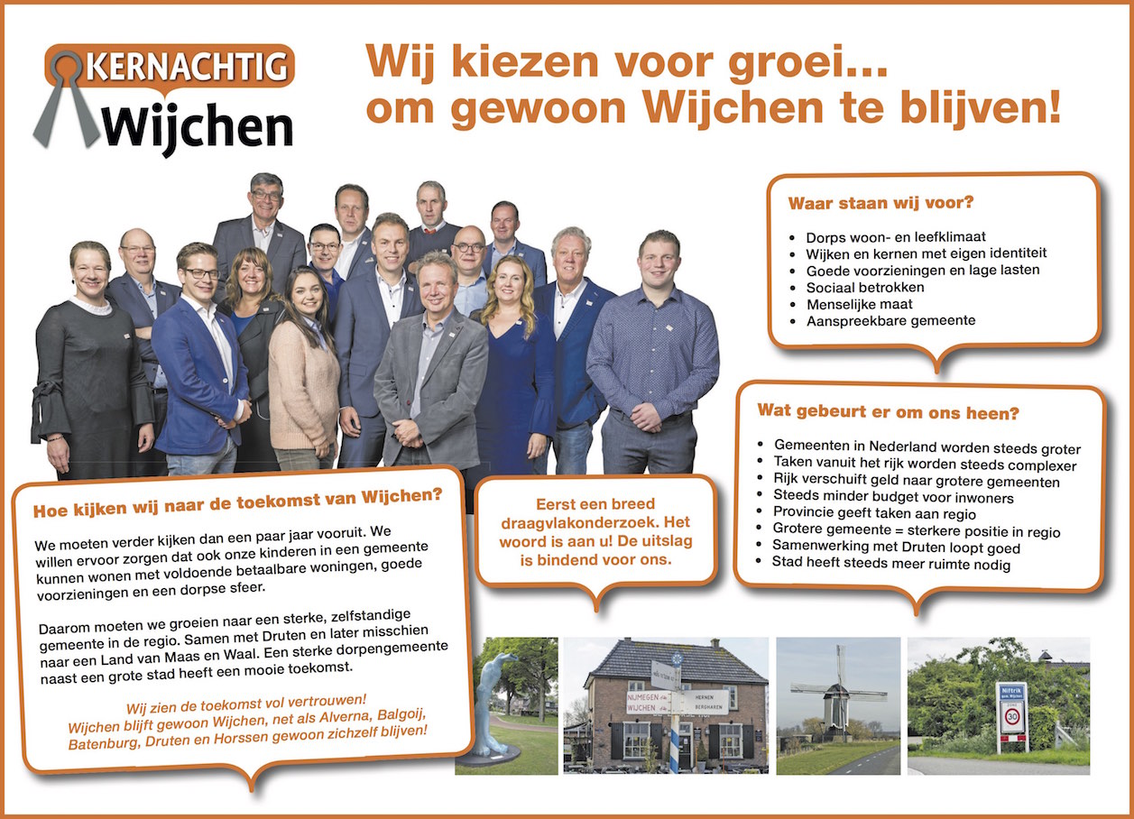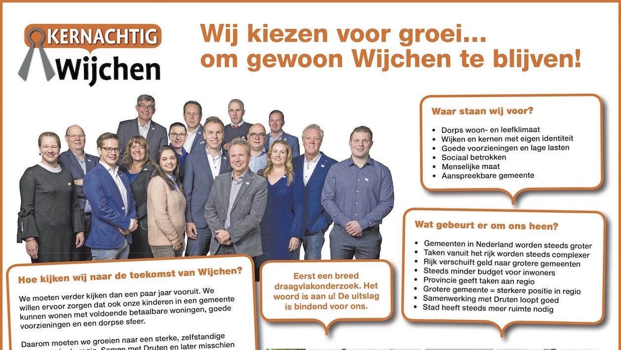 Wijchens grootste partij Kernachtig Wijchen meldt: “Hoe kijken wij naar de toekomst van Wijchen? We moeten verder kijken dan een paar jaar vooruit. We willen ervoor zorgen dat ook onze kinderen in een gemeente kunnen wonen met voldoende betaalbare woningen, goede voorzieningen en een dorpse sfeer.Daarom moeten we groeien naar een sterke, zelfstandige gemeente in de regio. Samen met Druten en later misschien naar een Land van Maas en Waal. Een sterke dorpengemeente naast een grote stad heeft een mooie toekomst.
