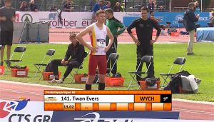 In de zandbak was het Twan Evers die het rood-geel van AV Wijchen mocht verdedigen bij het hinkstapspringen. De 25-jarige springer die zijn zesde nationale optreden had, kwam in zijn eerste sprong tot 13.02 meter. Zijn verste sprong van dit seizoen. Met een mindere twee sprong gevolgd door een goede 12.99 meter, wist hij zich niet meer te verbeteren. De 13.02 meter die op het scorebord staat is goed voor een tiende plaats van Nederland.