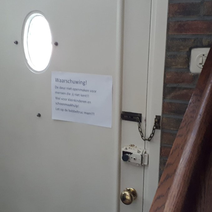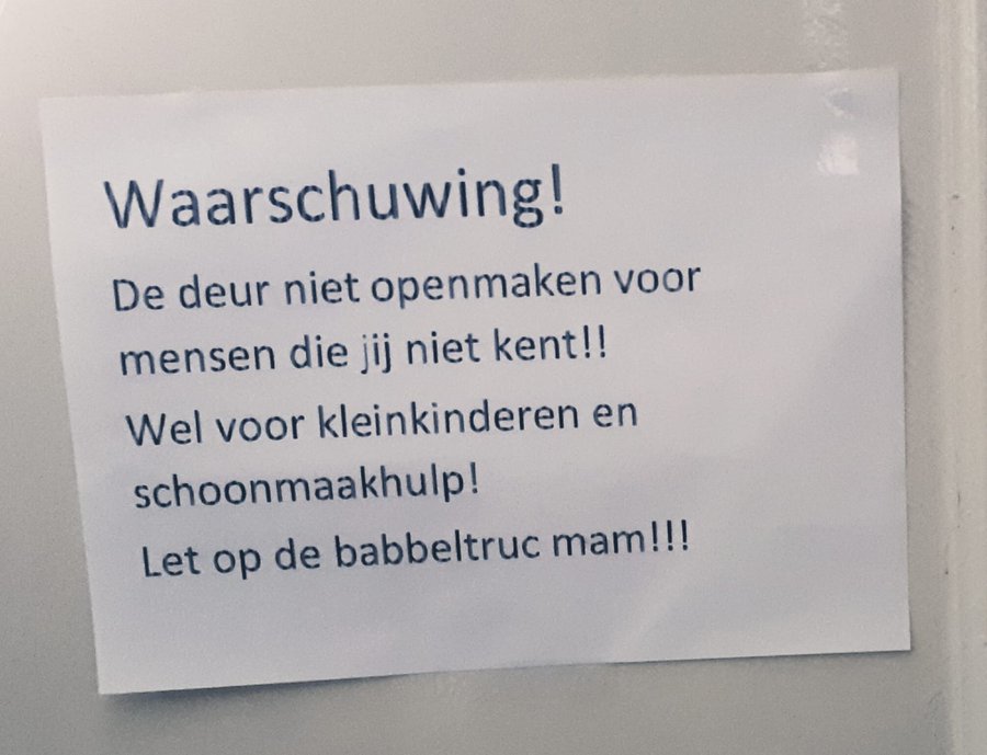 Begin deze week plaatste ik een tweet met tips om een babbeltruc te voorkomen en advies om die tips ook met (groot)ouders te bespreken. Vandaag was ik bij een hoogbejaarde wijkbewoonster en zag dat haar kinderen deze waarschuwing op de binnenkant van de voordeur hadden geplakt."