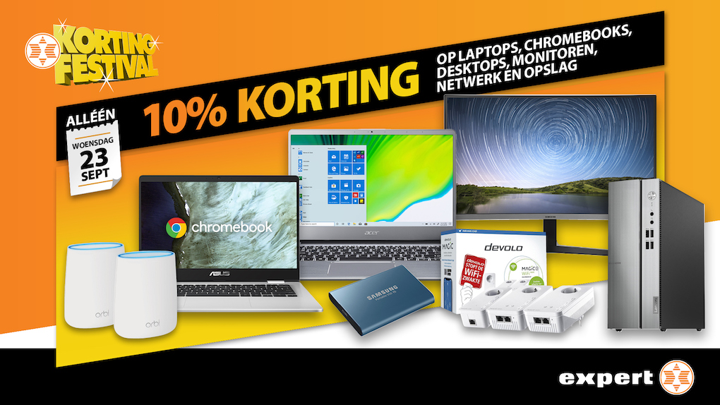 Bij Expert Wijchen is het elke dag korting! Bijvoorbeeld alléén op woensdag 23 september: 10% korting op laptops, chromebooks, desktops, monitoren, netwerk en opslag.