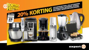 Bij Expert Wijchen is het elke dag korting, en alléén op donderdag 24 september: 20% korting op koffiezetters, volautomaten, waterkokers, blenders, keukenmachines, mixers en funcooking.