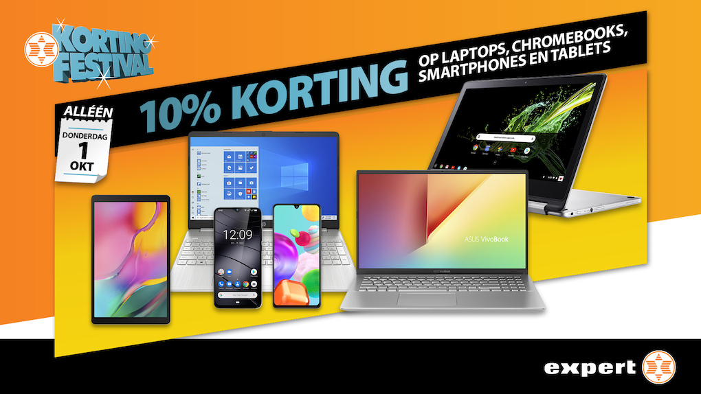 Bij Expert Wijchen is het elke dag korting, en alléén op donderdag 1 oktober: 10% korting op laptops, chromebooks, smartphones en tablets.