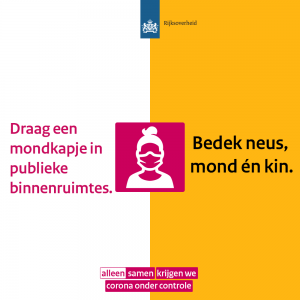 Draag een mondkapje in publiek toegankelijke binnenruimtes, zoals winkels, musea en stations. Dat wordt dringend geadviseerd. Ook mét een mondkapje op houd je 1,5 meter afstand. #alleensamen."