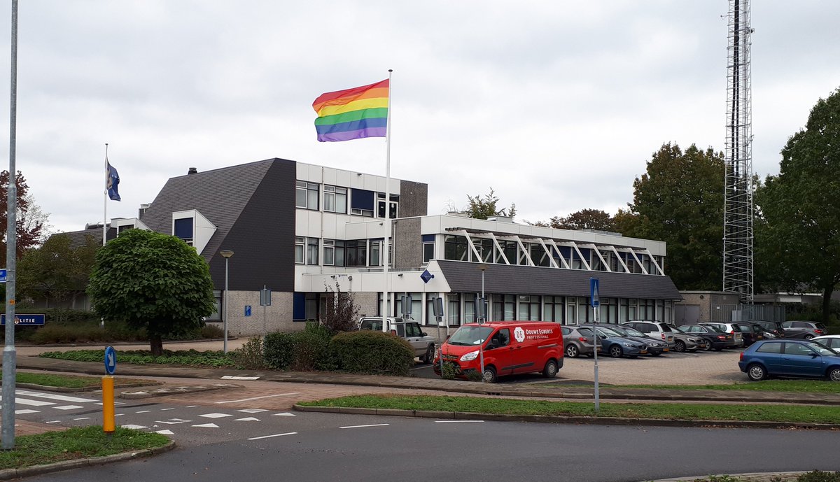 Wijkagent Henry van Galen reageerde op de 'Kom-uit-de-kast-dag'-tweet van burgemeester Van Beek: "Ook bij het politiebureau in #Wijchen wappert de regenboogvlag."
