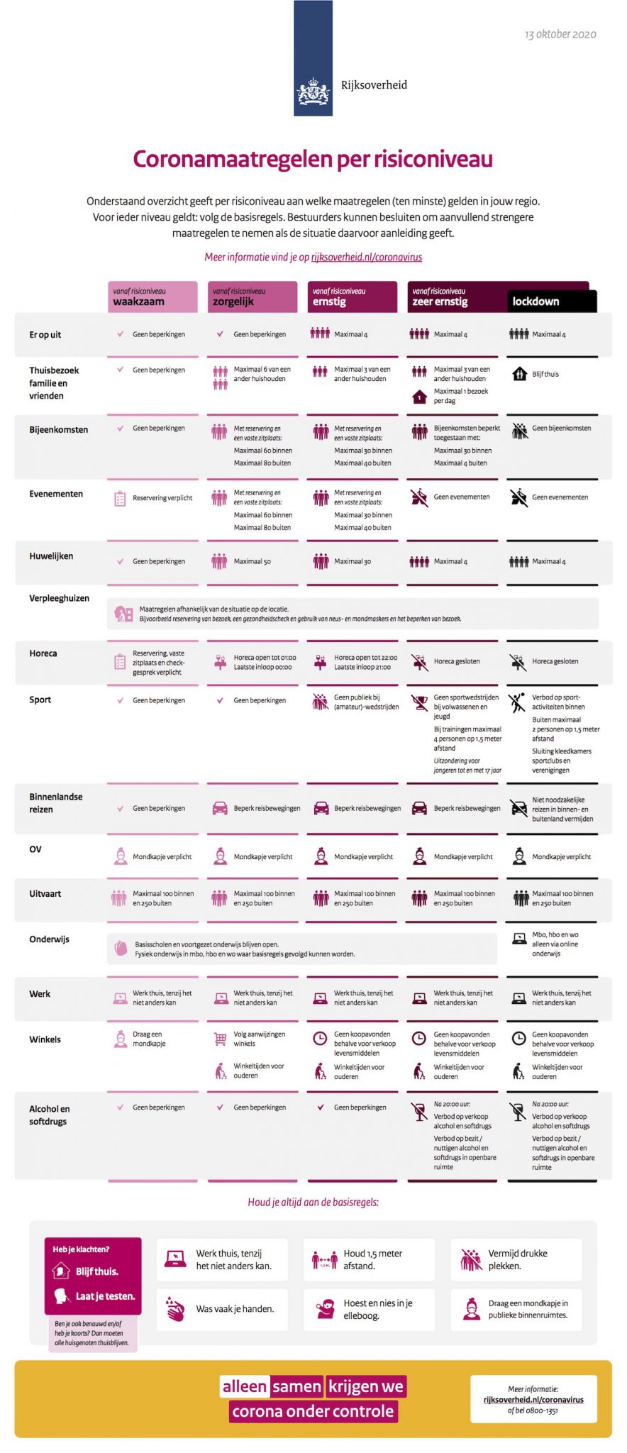 De persconferentie van vandaag, dinsdag 13 oktober, bevatte een aantal strengere maatregelen die ingaan vanaf woensdag 22.00 uur; we gaan naar een gedeeltelijke lockdown die we minimaal 4 weken moeten volhouden. Er komt meer toezicht op het naleven van de nieuwe richtlijnen. Er is een routekaart (