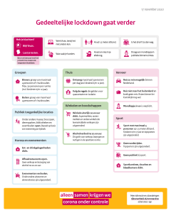 Het alcohol(verkoop)verbod na 20.00 uur blijft gehandhaafd en gevraagd wordt zo veel mogelijk thuis te werken, thuis te blijven en drukte te vermijden. Per 1 december geldt voor de publieke ruimtes een mondmaskerplicht. Per 1 december kunnen ook mensen zónder klachten, maar als ze via contactonderzoek gewaarschuwd zijn, zich (na 5 dagen in plaats van 10) laten testen.