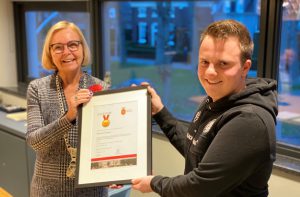 Burgemeester Marijke van Beek van de gemeente Wijchen heeft vanmiddag een Jongerenlintje uitgereikt aan de 16-jarige Stijn van Hemert. Vanwege de coronamaatregelen vond de uitreiking plaats in klein gezelschap.