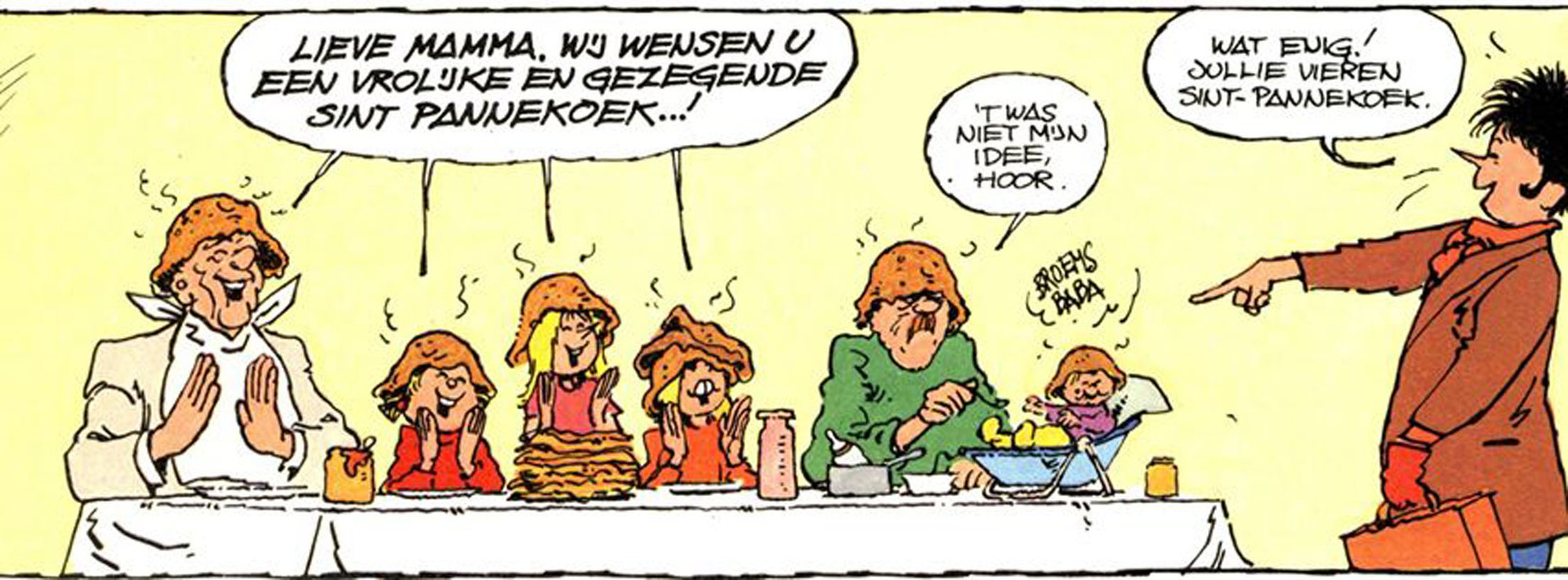 Sint Pannekoek wordt ieder jaar, door heel het land, gevierd op 29 november. Je legt een pannenkoek op je hoofd en zegt: ‘Wij wensen u een vrolijke en gezegende Sint Pannekoek!’