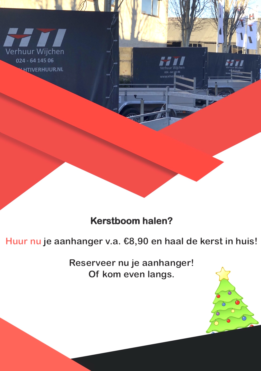 In deze kerstperiode wil iedereen het thuis gezellig maken en daar hoort natuurlijk een prachtige kerstboom bij. Maar hoe krijg ik zo’n grote boom nou in mijn auto? Daar hebben de professionals van HTI Verhuur iets op bedacht. Ze hebben aanhangwagens voor u beschikbaar in diverse maten. Hiermee haalt u gemakkelijk uw kerstboom in huis. En dat al vanaf €8,90 (mits u binnen 2 uur retour bent.)