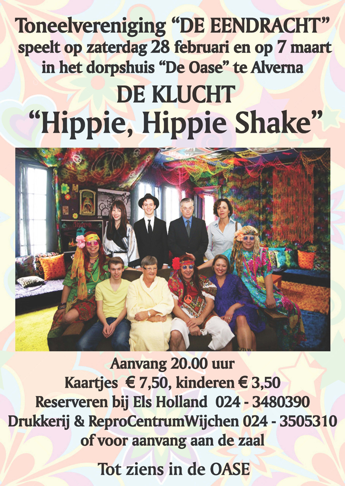 Toneelvereniging “De Eendracht” speelt op 28 februari en 7 maart in het Dorpshuis 'De Oase' in Alverna de klucht 'Hippie, Hippie Shake'.
