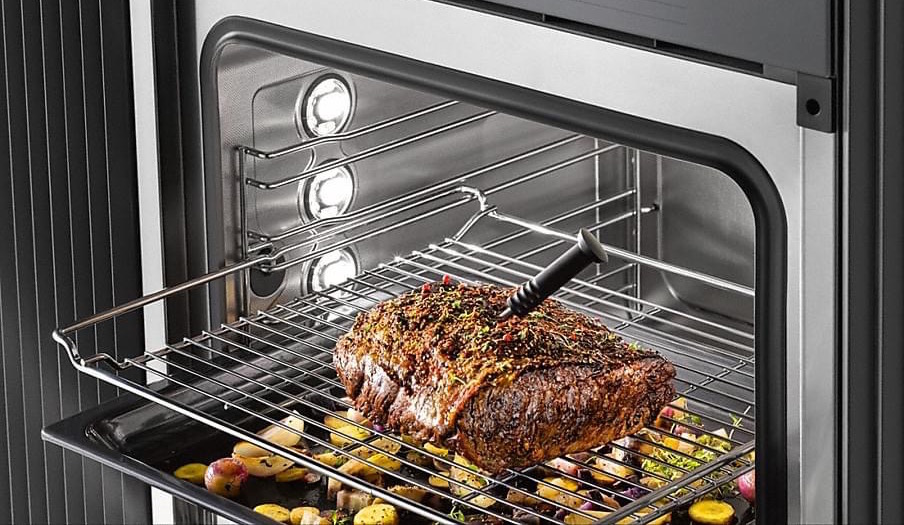 Met de voor Miele gepatenteerde draadloze bratometer braadt u vlees, vis en gevogelte op de graad nauwkeurig. En dat heel comfortabel zonder toezicht, want de weergave van de resterende tijd wijst u erop wanneer het gerecht gaar is.