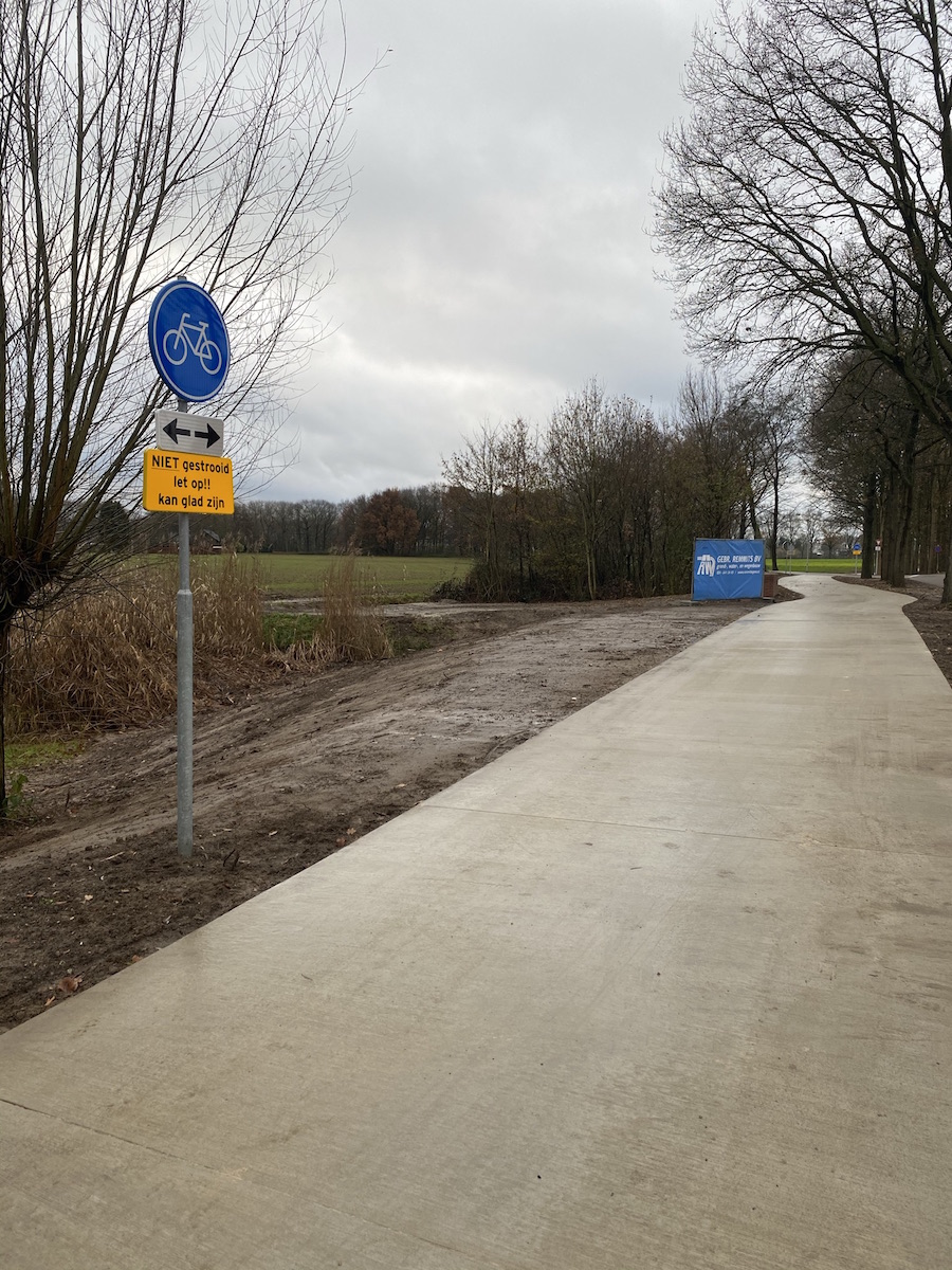 Het fietspad heeft nu nog geen belijning. Zodra het droog weer is en het ook lang genoeg droog blijft, komen de witte lijnen erop. Die zorgen voor een duidelijk zichtbare begrenzing richting de bermen (kantmarkering) én voor de afscheiding van de twee rijrichtingen. Het fietspad mag nu al wel gebruikt worden.