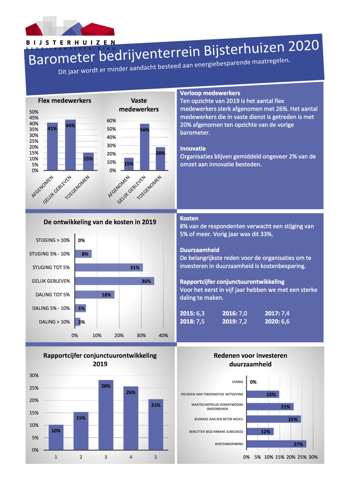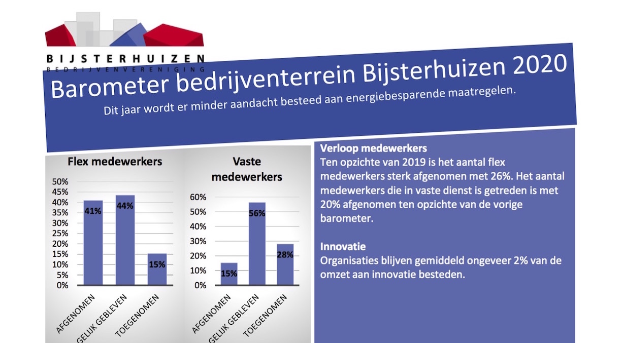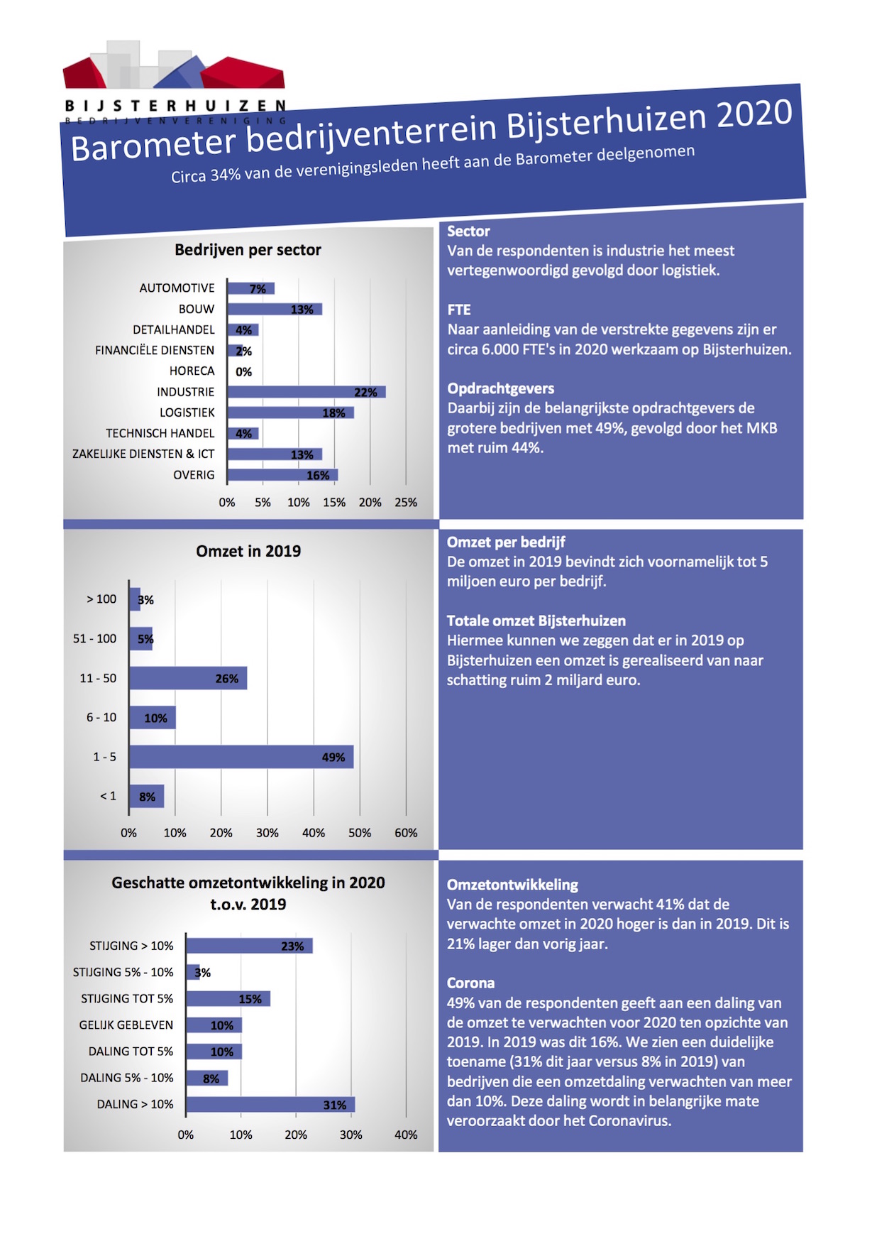 Dit is de conclusie die getrokken kan worden uit de jaarlijkse barometer die de bedrijvenvereniging Bijsterhuizen in 2020 wederom heeft laten opstellen. Jaarlijks organiseert de bedrijvenvereniging een enquête onder haar leden. Zo’n 34 procent van de leden heeft deelgenomen aan de barometer 2020.