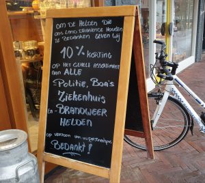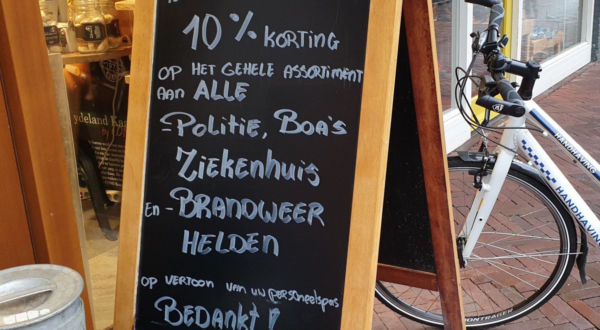 Dit bord staat in het centrum van Wijchen. We maken geen gebruik van deze kortingsmogelijkheid. Ondernemers hebben het in deze tijd namelijk extra zwaar en verdienen daarom onze steun. Maar wat een sympathiek gebaar van deze lokale ondernemer!"