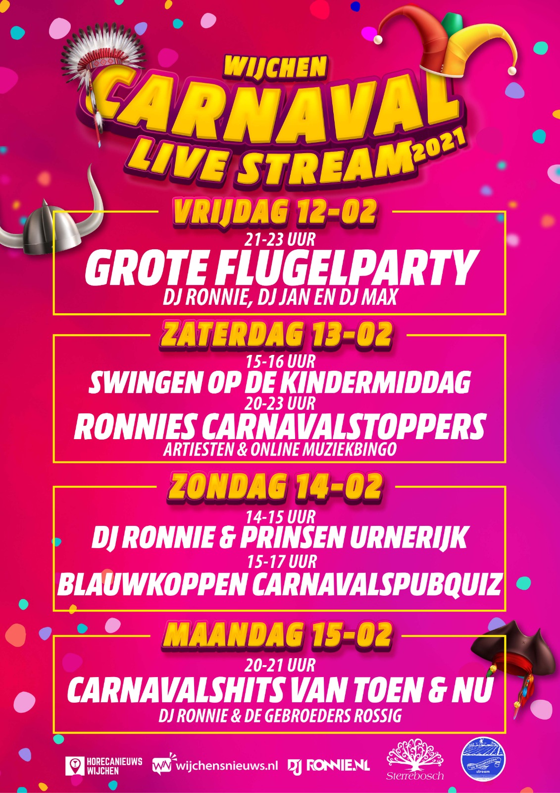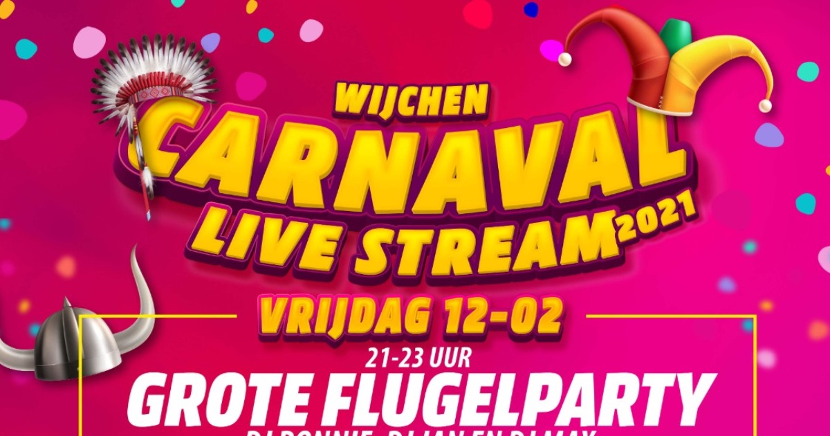 In een serie van 6 thuis te volgen livestreams gaan we u van vrijdag 12 februari t/m maandag 15 februari thuis vermaken met Carnaval Wijchen 2021. De Livestreams zijn bij alle deelnemende organisaties te bekijken. Dat worden dus duizenden kijkers! Er is tenslotte verder helaas niet veel te beleven in Wijchen.
