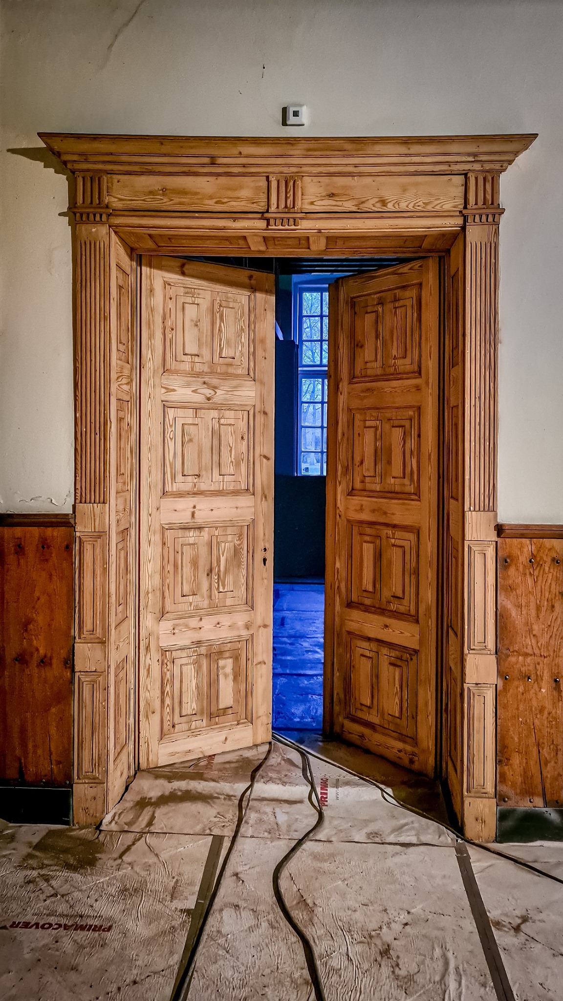 Op één van de foto’s zie je ook de prachtige deuren en kozijnen van de eerste verdieping die schoon zijn gestraald. En wat kwam er een berg stof vanaf! Mooi dat deze in ere zijn hersteld.