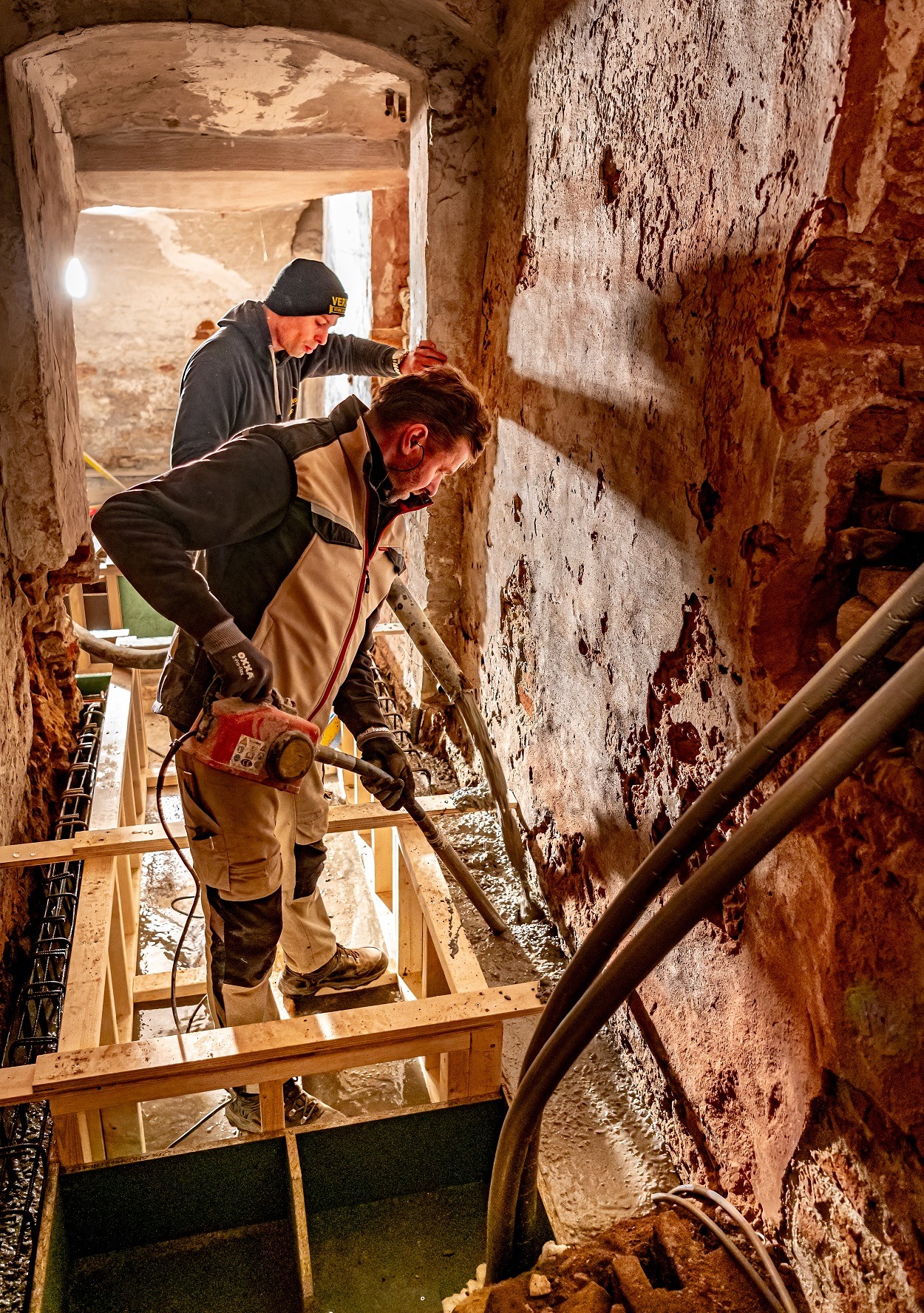 De bekisting voor de looproute in de kelder was al eerder klaar. Nu tijd voor het storten van het beton. Vanaf de voortuin pompte Verbo Betonpomp & Betonservice uit Wijchen het beton naar de kelder. Een trilnaald haalt de luchtbellen uit het gestorte beton."