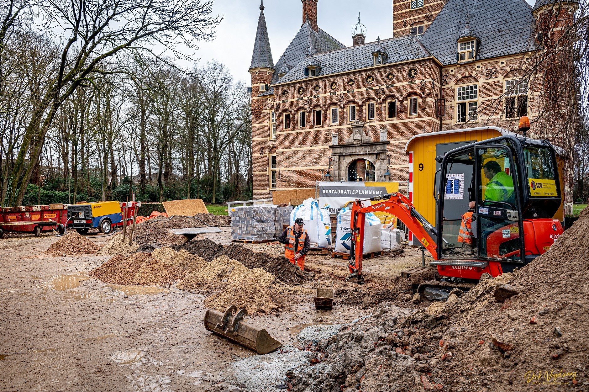 Facebookpagina: "De maand januari is bijna voorbij en er is weer veel gebeurd. Er is een nieuwe elektriciteitsaansluiting gelegd. Deze ging over de kasteelgracht onder de brug door.