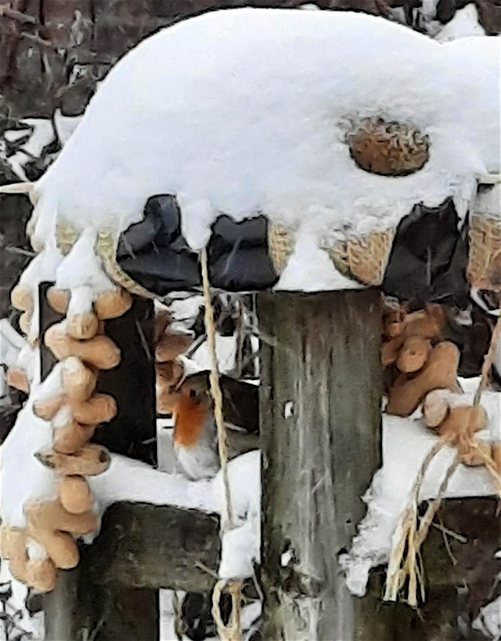 vogel... Een roodborstje schuilt voor de sneeuw.